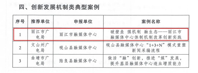 其中,由丽江市广播电视局推荐的“破壁垒 强机制 融生态——丽江市融媒体中心体制机制改革创新实践”案例,获评2025年省级广播电视媒体融合创新发展机制类典型案例。
