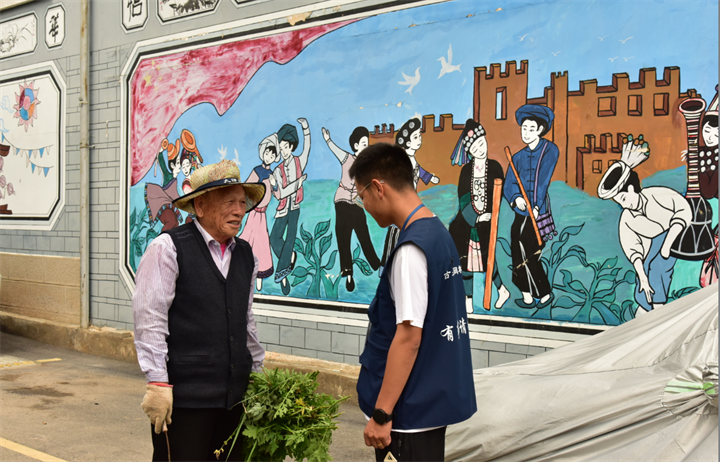 “石榴籽”联络员和金明(右)与社区居民聊天。(丽江融媒记者 李琳 摄)