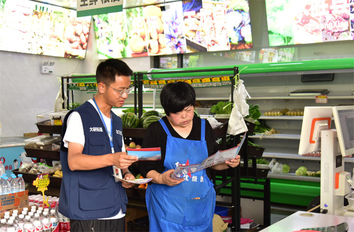 “石榴籽”联络员和金明(左)向商户宣传政策。(丽江融媒记者 李琳 摄)