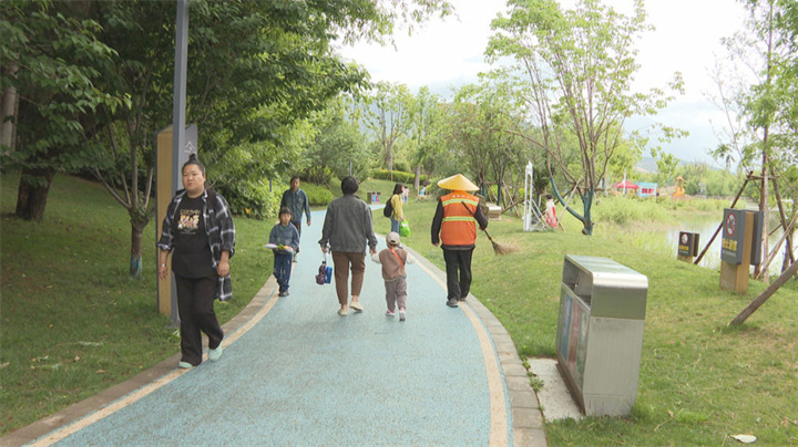 市民游客在中济海公园康养绿道上散步。(丽江融媒记者 张丽瑶 摄)